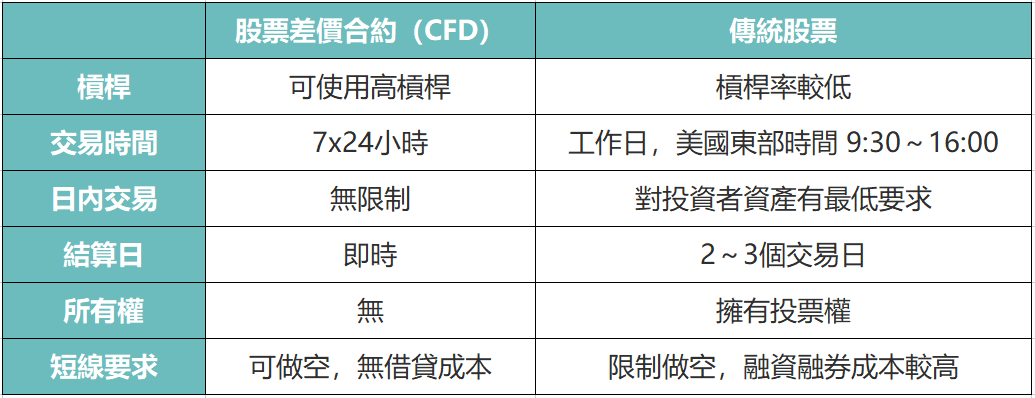 与传统的美股交易相比,CFD的好处之一是具有更高的杠杆。这意味着投资者可以通过较低的成本获得比传统投资更大的回报。如果想做空某只股票,使用CFD可以在任何时间做空,并且没有融券成本。此外,对于日内交易的需求,CFD也可以无限满足。
