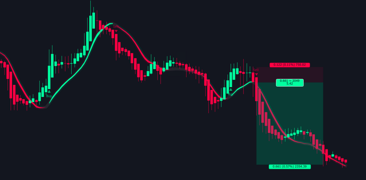 Dengan melihat situasi perdagangan real-time, kami akan menilai sinyal beli dan jual Bollinger Band. Kita dapat melihat bahwa tren turun yang kuat dalam momentum pasar memaksa harga di bawah Bollinger Band yang lebih rendah. Langkah ini menciptakan sinyal beli awal kami karena harga mulai diperdagangkan di luar wilayah penahanan 95%. Selain itu, harga menembus di atas garis tengah untuk lebih membenarkan sinyal beli.