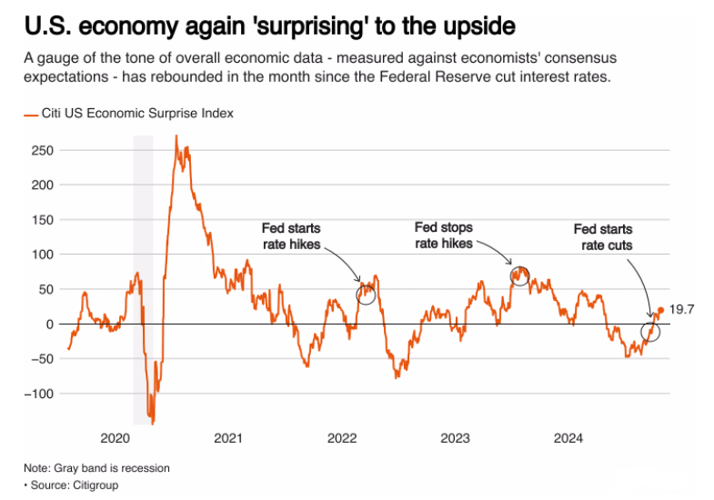 Over the past month, U.S. economic data has defied Wall Street expectations. The Citi Economic Surprise index, a gauge of U.S. economic data, has surged to its highest level since April.