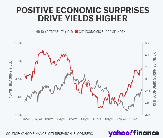 Meanwhile, the yield on the 10-year U.S. Treasury note is also climbing. It has risen approximately 50 basis points over the past month, approaching the 4.2% level. In some cases, rising Treasury yields could weigh on stocks. But Callie Cox, chief market strategist at Ritholtz Wealth Management, noted in her analysis that this could still be a positive sign for stocks if rising yields are accompanied by stronger economic growth.