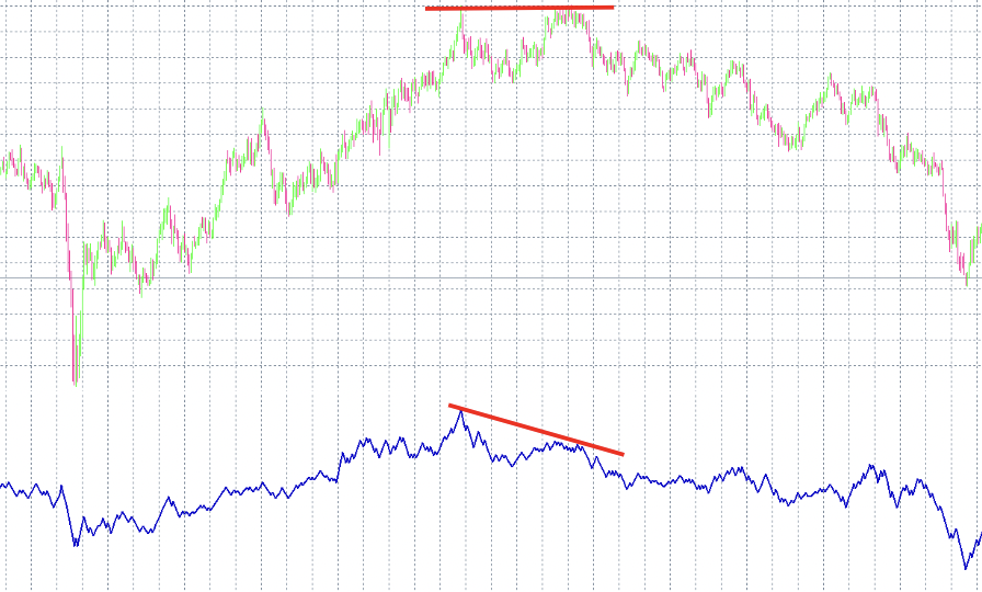 นอกเหนือจาก OBV Indicator การมองหาความขัดแย้งในทิศทางของราคา กับกราฟแสดงผลวิเคราะห์ทางเทคนิค ยังเกิดขึ้นเมื่อใช้เครื่องมือที่เรียกว่า Relative Strength Index (RSI) ที่ใช้หาสัญญาณระบุแนวโน้มขาขึ้น (Bullish) และขาลง (bearish) ของราคา