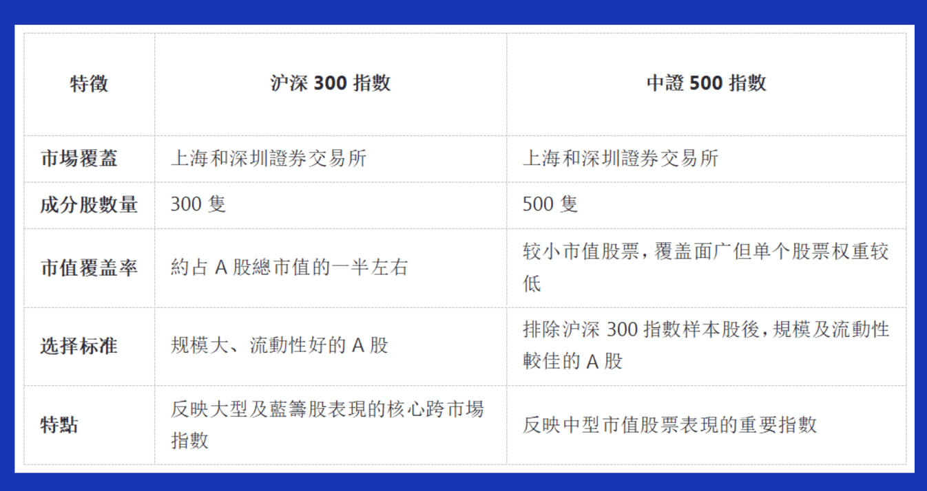 除了滬深300指數作為中國大陸股市的核心寬基指數,反映大型及藍籌股的表現之外,中證500指數同樣是中國A股市場的重要指標,但兩者在樣本股選擇、市值覆蓋率以及所代表的市場特徵等方面有顯著差異。