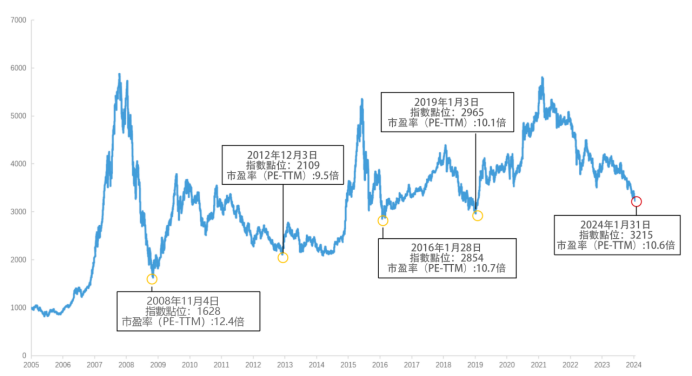 2019年初至2024年初,滬深指數從2965點上升至3215點,本益比從10.1倍上升至10.6倍。這一階段市場穩步上升,投資者信心增強。隨著全球經濟的逐步復甦和國內經濟政策的持續支持,市場信心增強,指數穩步上升。