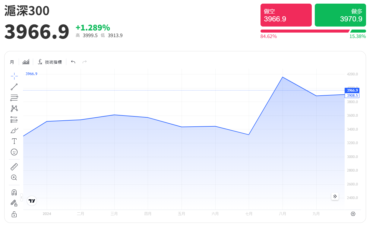 年初至10月初:滬深300指數在年初時點約3,300點左右。整體來看,指數在年初至10月初期間波動較小,大致在3,300點至3,600點之間波動,顯示市場相對穩定。
